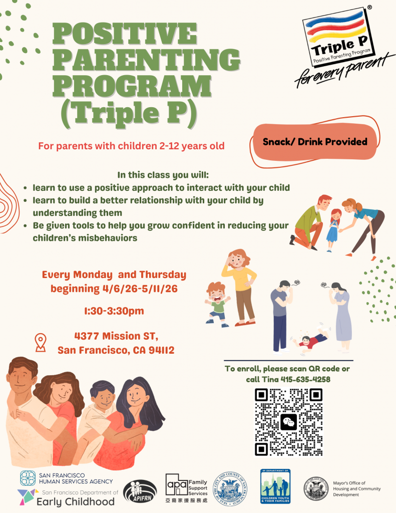 APA Excelsior Cantonese group Triple P parenting class every Monday and Thursday starting April 6, 2026 from 1:30-3:30pm 4377 Mission Street SF CA 94112 contact Tina 415-635-4258 or click read more link below to access flyer and scan QR code